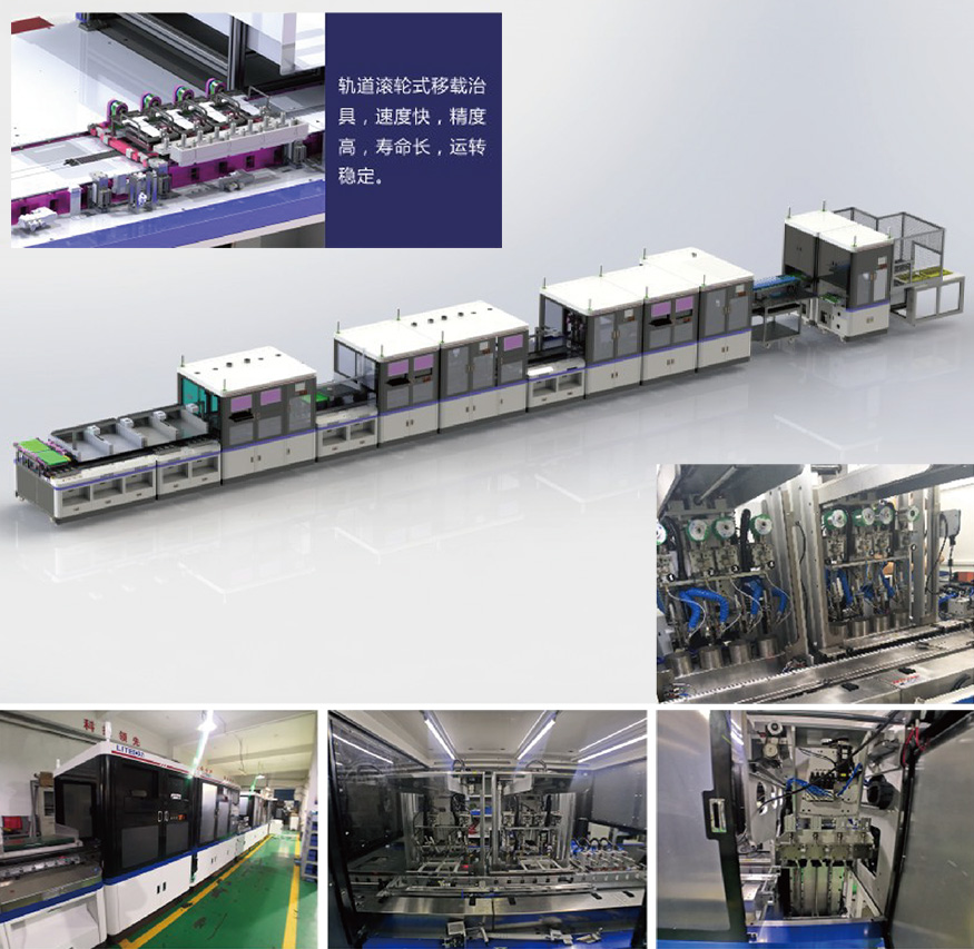 主要特點(diǎn):治具采用輪組軌道配合,高速高精度定位,精度+0.05mm,提高產(chǎn)能。